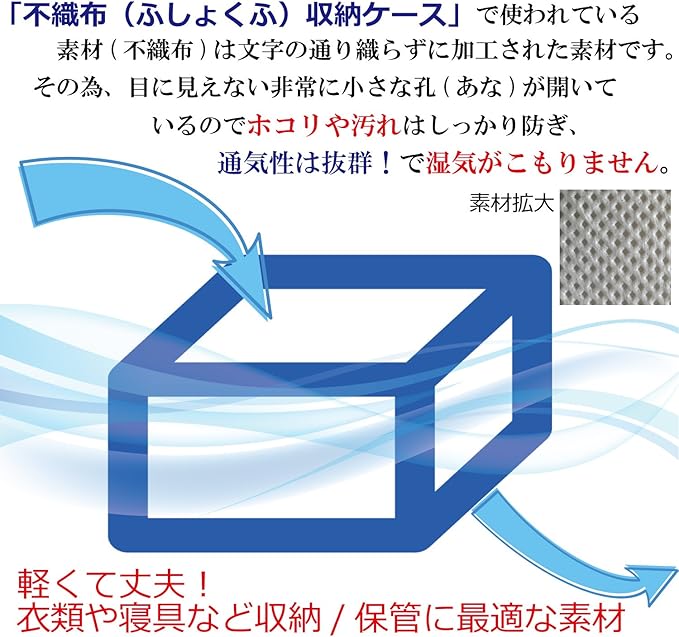 【通気性の良い布団収納ケース】通気性の良い厚手不織布製。前面に活性炭シートを加工し、大切な布団や寝具をにおい・ホコリ・汚れから守ります