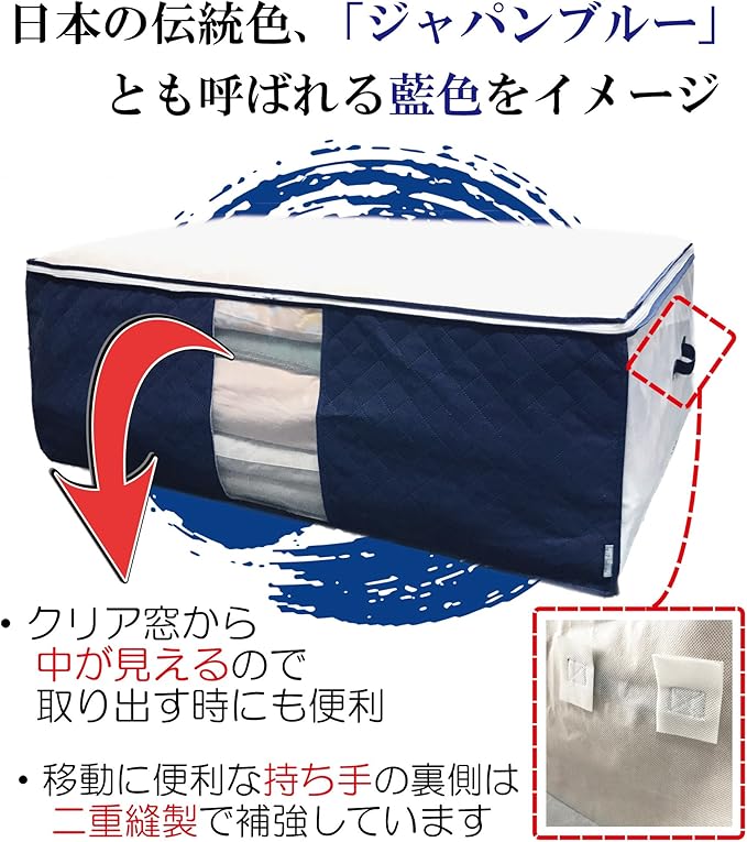 【透明窓・大きなファスナー・両サイド持ち手付】透明窓付きなので収納した寝具が見えて便利。大きく開く上部のファスナーで出し入れも簡単。両サイド持ち手付で移動や持ち運びにも便利