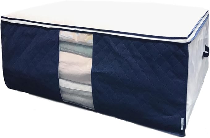 【商品仕様】サイズ/(約)幅100x奥行70x高さ35cm 本体重量:280g カラー/ホワイトx藍色 内容/1枚 収納目安/掛け布団(シングル)・敷布団(シングル - シングルロング) 各1枚 材質/ポリプロピレン不織布・ポリエチレン・活性炭シート 生産国/中国 ※洗えません