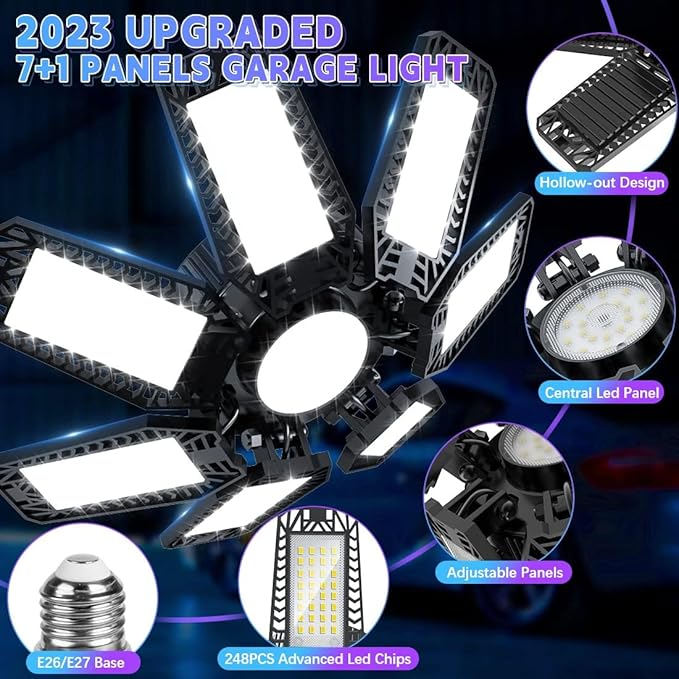 LEDガレージライト:264個の高輝度LEDランプビーズを搭載し、ちらつきなく目を保護し、10000kの昼光白色光の下で柔らかく快適な楽しみを提供し、視覚的疲労を軽減する。