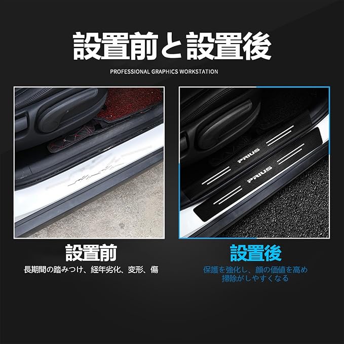 【耐久性に優れた高品質素材】炭素繊維調素材を採用し、強度と耐久性に優れています。防水・防汚・耐熱性にも対応しており、過酷な環境下でも品質を維持。日常使用の摩耗や衝撃からステップ部分をしっかりガードし、車の美観を守ります。