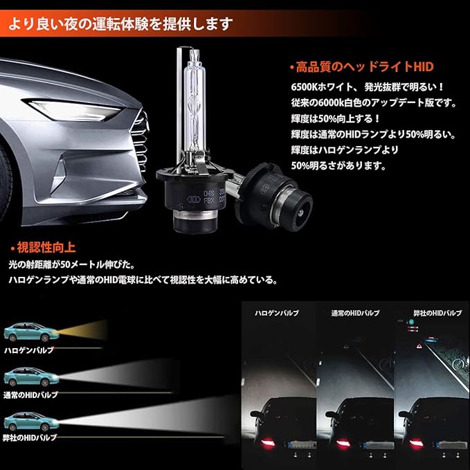 【発光抜群で明るいのHID電球(アップグレード版)】高純度99.99%のキセノンを採用する、高透過強力光エネルギーを発生。純正HID D4S 6500kホワイト。従来の6000kホワイトのアップデート版です。ハロゲンランプや通常のHID電球に比べて視認性を大幅に高めている、光の射距離はさらに長い。最適な配光を実現!