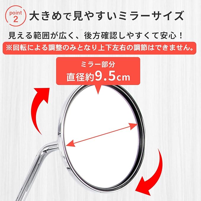 サイズ:原付きなどにあう 8mm ネジ 正ネジ ※逆ネジのバイクのミラーには直接ご利用いただけませんので、ご利用の際は別途アダプタをご用意ください。※ミラーの調節は、360度の回転のみの調節となりまして、上下左右への調節はできません。
