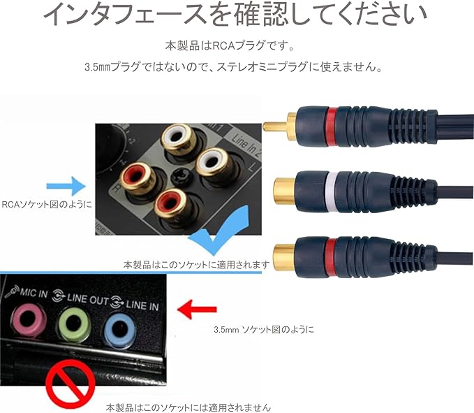 【注意喚起:本製品はRCAプラグです。3.5㎜プラグではないので、ステレオミニプラグに使えません。】