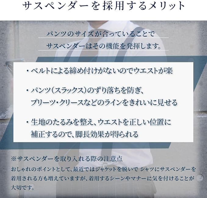 フォーマルシーンはもちろん、ビジネス、カジュアルでも使えるサスペンダー。 ベルトを使わず、美しいシルエットを保つことができます。 ベルトによる締め付けがないので、ウエストが楽。 脚長効果が得られます。 安心の日本製です。 サスペンダーの品質には十分に注意を払っておりますが、使用上以下の点にご注意ください。 *色移りする場合がございますので、汗や水濡れにご注意ください。 *サスペンダーのクリップはベルト通し(ベルトループ)の部分を避けて装着してください。 *サスペンダーのクリップは、ベルトの上からはさまないでください。 *サスペンダーのクリップのふたが閉まりにくいほど厚い生地、または厚い部分をはさまないでください。 *サスペンダーを装着する際は、ズボンを吊り上げる以上の力がかかる状態でのご使用は避けてください。