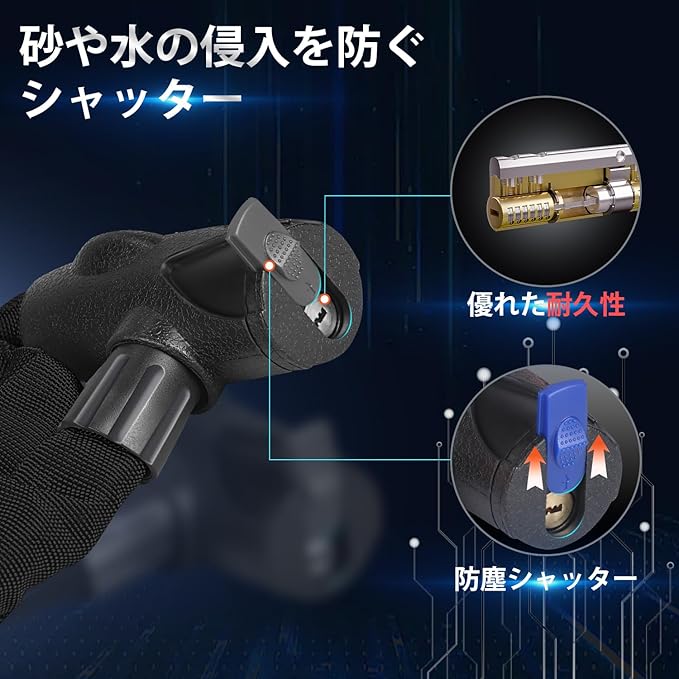 【防塵シャッター設計】チェーンロックは防塵シャッターを設計されており、キーシリンダーに埃や砂などの侵入を防ぐとともに、水の浸入を防ぎ、ロックの使用寿命を延長します。防塵設計は、ロックの耐久性を高めるだけでなく、日常のメンテナンスの必要性を減らし、手間をかけずに便利に使用していただけます。