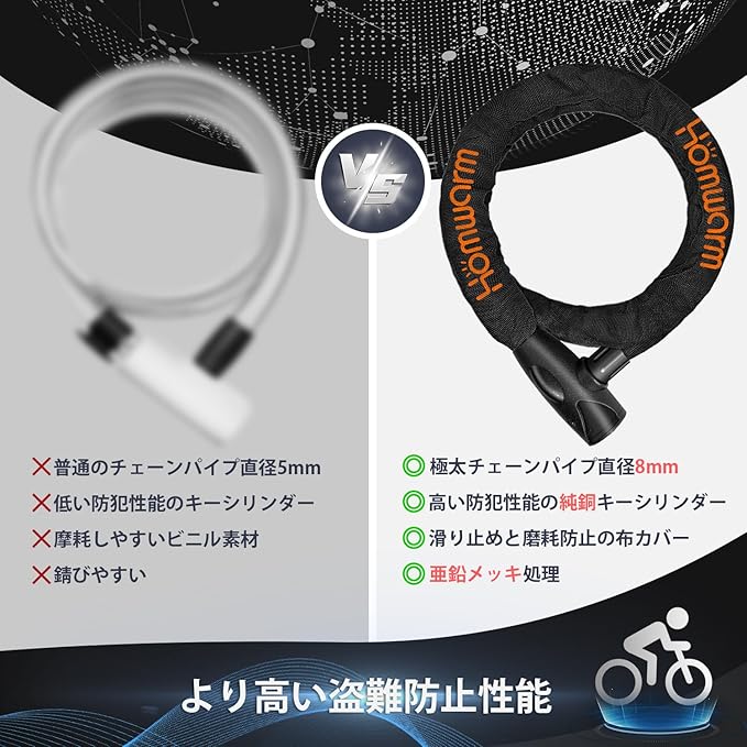 Homwarm バイクロック チェーンロック 頑丈 盗難防止 鍵3本付き 極太 長さ1600mm チェーンパイプ直径8mm 多用途 自転車 バイク ワイヤーロック 防錆 (ブラック, 160cm)