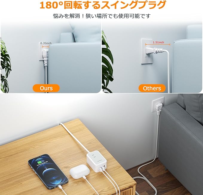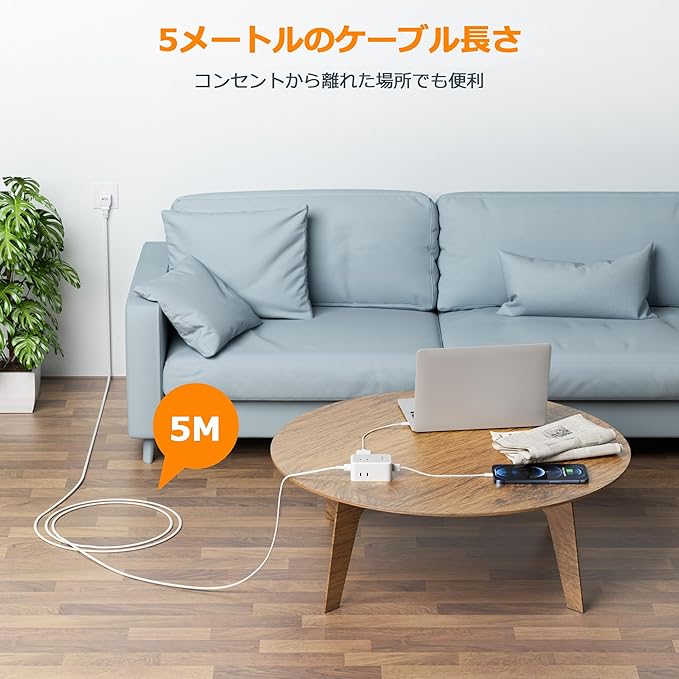 【使用便利】タコ足コンセントのケーブルが5mと長いため、コンセントから離れた場所でも便利。それに、180 スイングプラグで、狭い場所での使用にも対応しています。