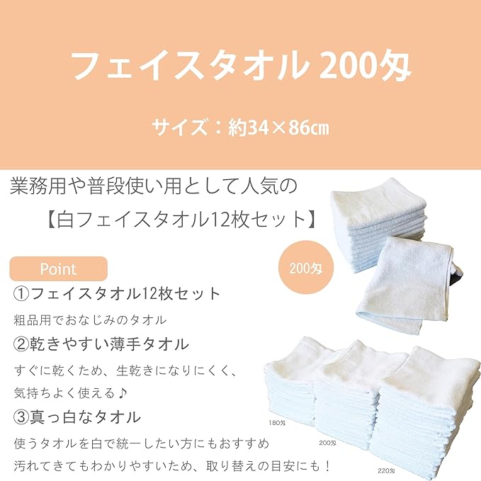 業務用や普段使い用として人気の【白フェイスタオル12枚セット】です。 ■何にでも使いやすいタオル 200匁は粗品用として使用されることの多い厚みのタオルです。 ほどよく薄いため、濡らしても絞りやすく、また乾いた状態でも使えます。 ■白タオルのメリット 一般的なフェイスタオル(約80cm)よりも長め(約86cm)のため 頭や首に巻いて汗取りにもおすすめです。 薄いのでモタモタしない、乾きやすいと白タオルならではのメリットも! 綿100%なので、安心して使用できます。 濡らしても乾きやすいため、いやな臭いが発生しにくいのもポイントです。 ■柄のない白タオル 使うタオルを白で統一したい方にもおすすめです。 リーズナブルな値段でまとめて取り替えられるため気分も一新できます。 汚れてきてもわかりやすいため、取り替えの目安にもなります。■平地(平織り)部分のない総パイル 粗品用限定商品タオルでは、プリント部分がパイルのない平地になっている場合が多いですが この商品は使い心地重視の総パイル仕様です。 パイルがあることで、平地部分よりも吸水性、肌触りが良いため気持ちよく使用できます。 【サイズ】34 86cm 【カラー】白 【素材】綿100% 【生産国】中国 【仕様】12枚セット、200匁(約62g/枚)、総パイル(平地部分なし)