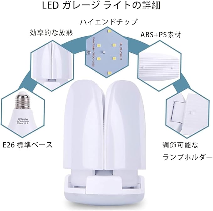 ガレージ 照明 60W ガレージライト led:5灯式の高輝度LEDパネル、合計156個の高輝度LEDランプビーズを備えている。LED 照明器具を使用し、80%の省エネ、環境に優しく、費用効果が高い。ガレージライトは、作業時に6000ルーメンを出力します。口金:E26 定格電圧:AC85-265V 定格電流:500mA/1000mA 消費電力:80W ルーメン:6000lm ライト色:昼白色 演色性:>80