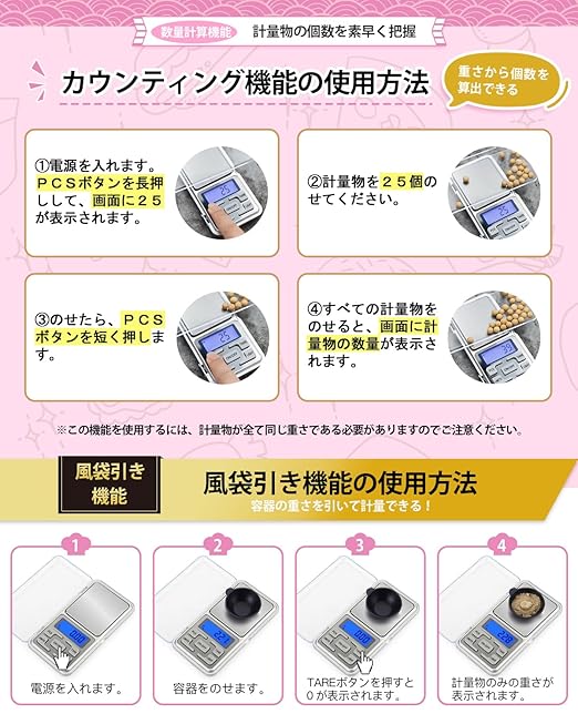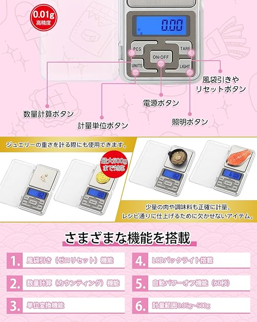 4.【特殊機能】風袋引き機能、カウンティング機能、自動パワーオフ機能(60秒)、低電力提示(LO)、過重量提示(0_Ld、EEEE)、自動校正機能を搭載しております。また、LEDバックライトがついていて、便利です。※もし正確な計量ができない場合は、校正機能をお試しください。