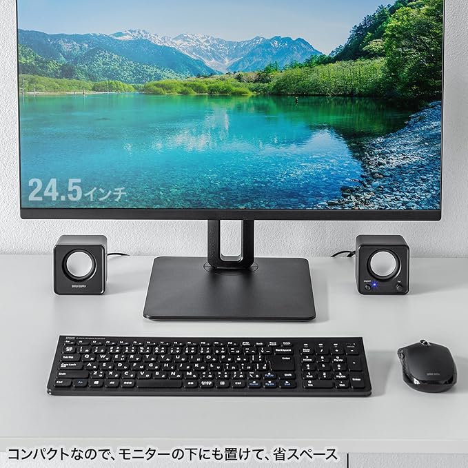 超コンパクトサイズなので、モニター下や机上ラック上など設置場所を選ばず省スペースに設置ができます。