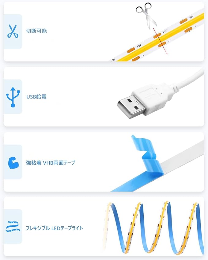 【5V USB COB LEDテープライト】 1M 320leds/m, DC5V, 9W/M, 3000K,電球色, CRI>85, 超明るい,高密度。本製品は、DC5V USBポート、携帯充電器/USB HUB/USBソケット/コンピュータホスト/テレビなどで使用することができます。このUSB COB LEDテープライトは、日常の使用に非常に適しています。持ち運びに便利で、操作も簡単です。USBケーブルの長さは1メートルで、十分な長さで簡単に接続できるのが素晴らしい!現代的な照明とインテリアの第一選択です。