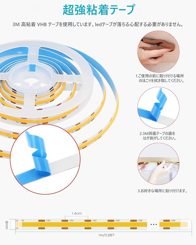 「自由に接続・切断可能」:このCOBテ一 プLED はカットライン(2.5cmごと)に沿ってカットすることができます。 また、貼り付けとカットが可能なため、様々なニーズに合わせて、好きな長さと形を実現する自由度が高いです。最強の粘着剤と8mm幅で、キャビネットの装飾、エッジフック、ワードローブなどの狭い場所にも簡単に取り付けることができます。