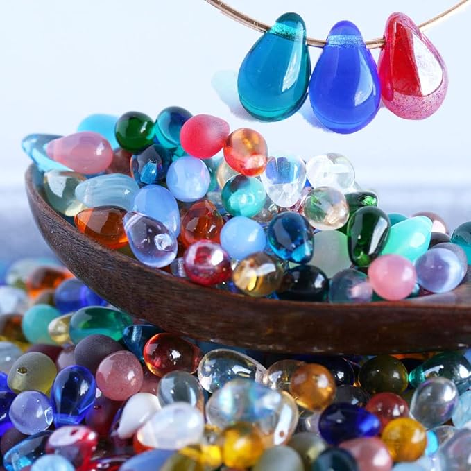 チェコガラスビーズのドロップ9 6mmおよそ100個をランダムカラーでセットにしたアソート商品