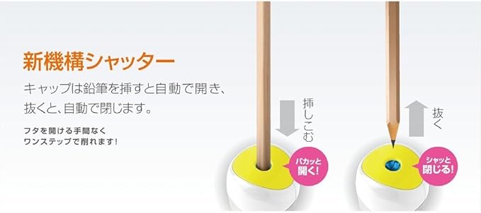 新機構シャッタ-:キャップは鉛筆を差すと自動で開き、抜くと自動で閉じます。