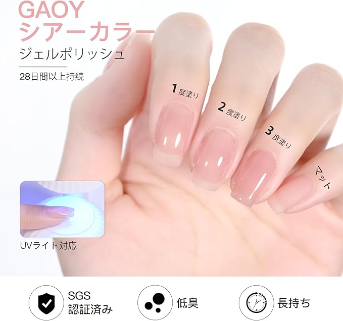 4週間長持ち: ベースジェルを塗る前に爪の表面をなめらかに整えると、良いテクスチャーを作ります。カラージェルの後にトップジェルを塗ると、 みずみずしい光沢のある仕上がりになります。