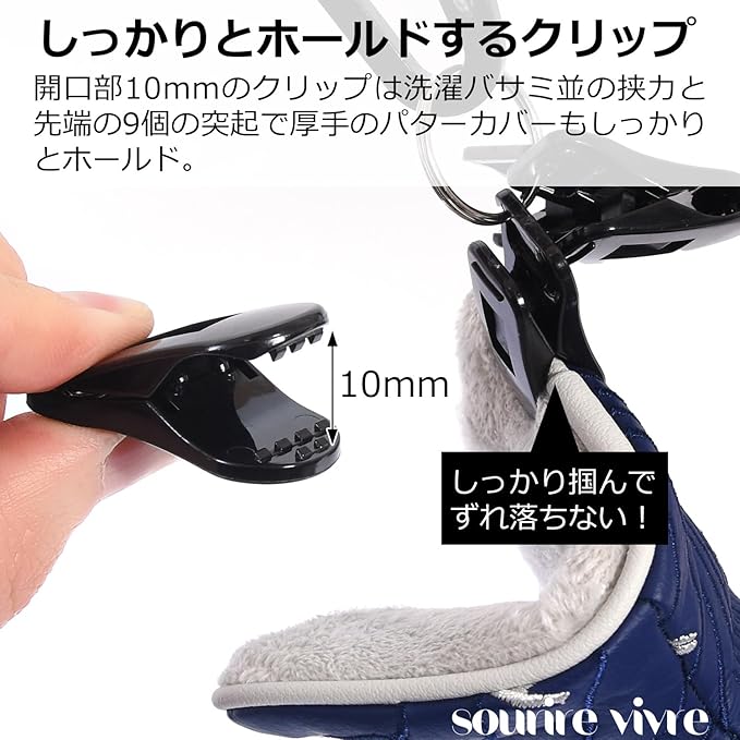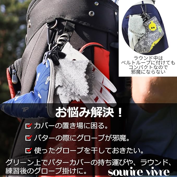[sourire vivre] パターカバーホルダー グローブホルダー あると便利なミニタオル付き 開口部10mm大口径強クリップ 取外し簡単 ゴルフ パターカバーキャッチャー