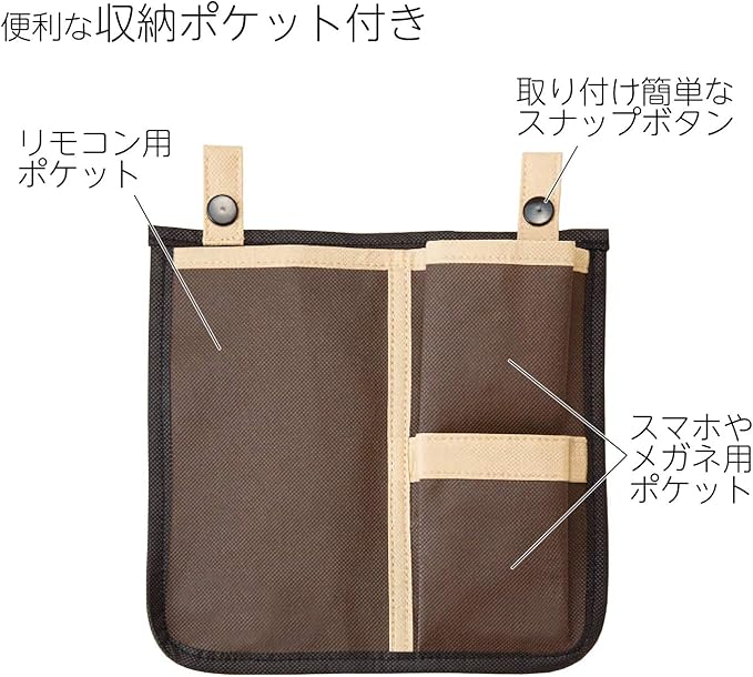 テレビのリモコンやスマホやメガネを収納できるポケット付き