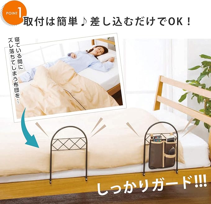 マットレスに差し込むだけのカンタン設置布団のズレ落ちを防止するベッドガードです2個組でベッドの形状やお部屋の配置、お好みに応じてアレンジ自在スリムでコンパクトなのでジャマにならず、ブラックカラーのシンプルなデザインで、どんなお部屋にもマッチしますリモコンやスマホが入れられる便利な収納ポケット付き※本商品は人体の転落防止用ではありません布団のずれ落ち防止用として使用してくださいサイズ:縦39 横25 奥行33cm(組立時/1個)セット内容/本体 2、差込みバー 2、ナット 4、袋ナット 4、簡易スパナ 1、収納ポケット 1