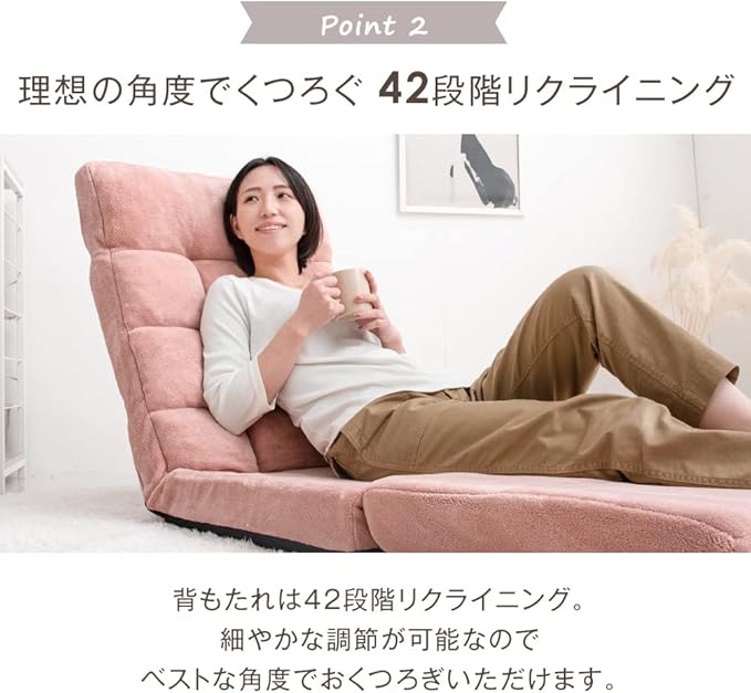 【スタッフのおすすめポイント!】・シーンに合わせてスタイルチェンジ!3way座椅子 座椅子・カウチ・ベッドにスタイルチェンジ ・大人かわいいニュアンスカラー ・もこもこキルティングで座り心地◎ ・リクライニング42段階+ヘッドリクライニング5段階 ・高い品質と耐久力を誇る日本HOTのギア使用 ・肌触りの良いマイヤー生地 ・折り畳み収納OK
