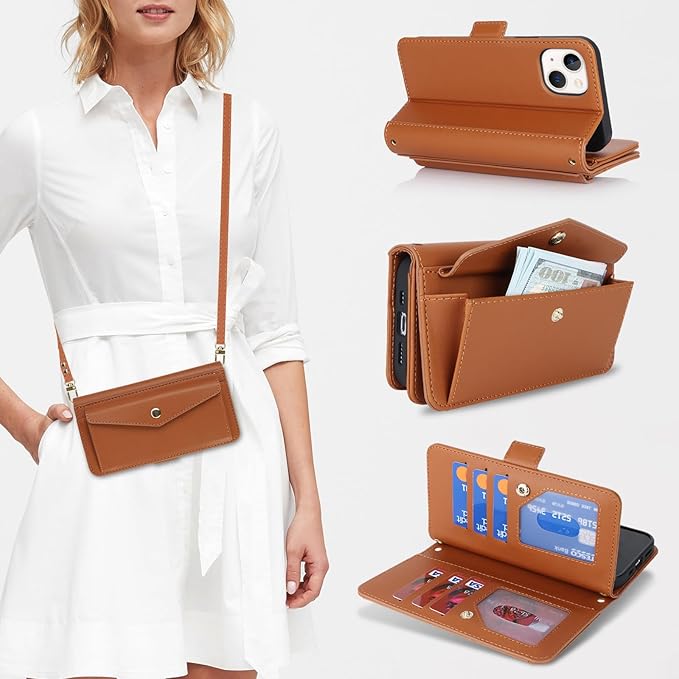 Eastwave for iPhone 14 Plus ケース ショルダー クロスボディアイフォン 14plus 留め具 肩がけ 首掛け 斜め掛け カードケース for iPhone14 Plus 手帳型 携帯 ケース case 財布型 カード収納 小銭入れ PUレザー 6色ブラウン
