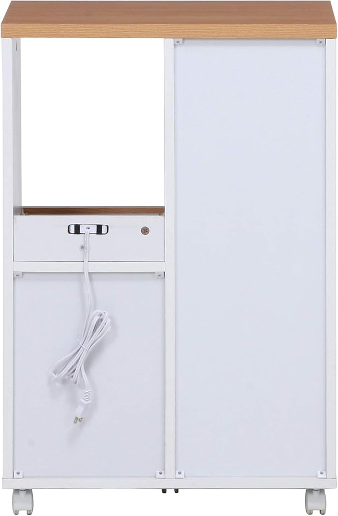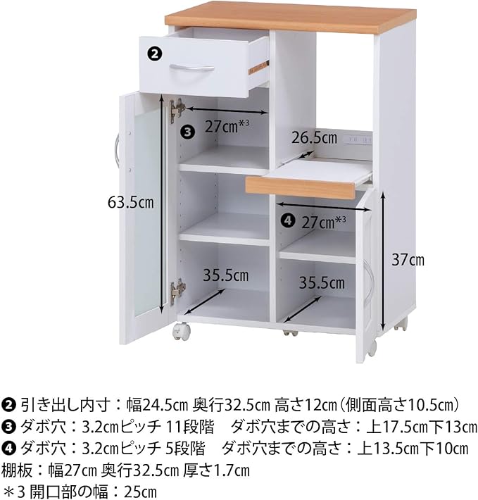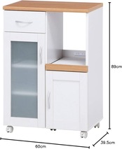 シンプルで置きやすいキッチンカウンター、トレーは引きだすことができ、レンジや炊飯器の収納にピッタリ、移動に便利なキャスター付きです。ホワイト色が清潔感のあるデザインでシンプルなデザインで他の家具に合わせやすくなっています。