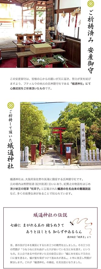 この安産祈願ベアは、皆様の心からの願いが天に届き、努力が実を結び ますよう、プティルウの地元の氏神鎮守社である「蟻通神社」にて 心願成就をご祈祷頂いたものです。 ご祈祷して頂いた蟻通神社は、大阪府泉佐野市長滝に鎮座する氏神鎮守社です。 元の境内は熊野街道(紀州街道)沿いにあり、紀貫之の物語をはじめ 清少納言の随筆「枕草子」に記載された蟻通の社名由来の難題説話 など、多くの故事伝承があることで知られています。