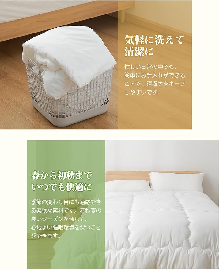 【軽くてふわふわ】わた量を通常の掛け布団の半分ほどにすることで、ふわっと軽くて体への負担を感じさせないです。適度に保温性があり、春から初秋にぴったりのアイテムです。