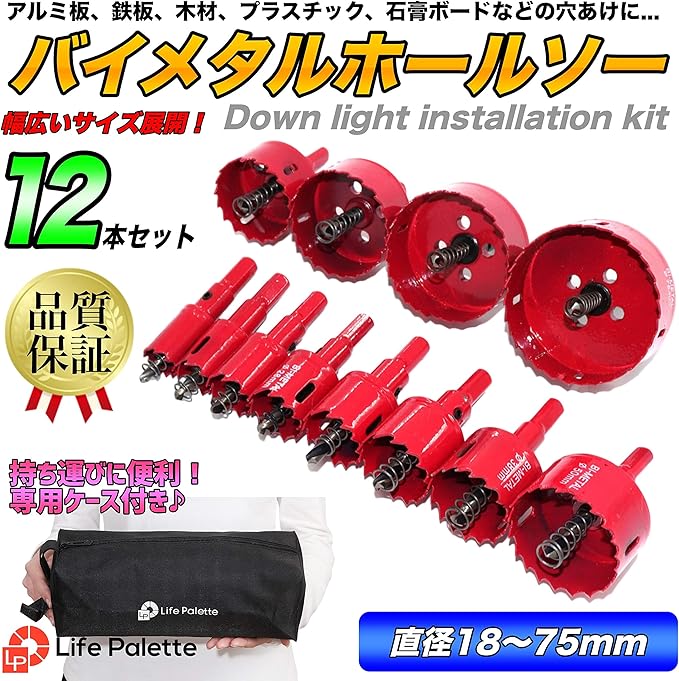 ライフパレット バイメタル ホールソー ホルソー セット 穴あけ 切削 木工 工具 工具ケース付き (12, 18 20 24 28 30 35 38 45 50 55 65 75mm)