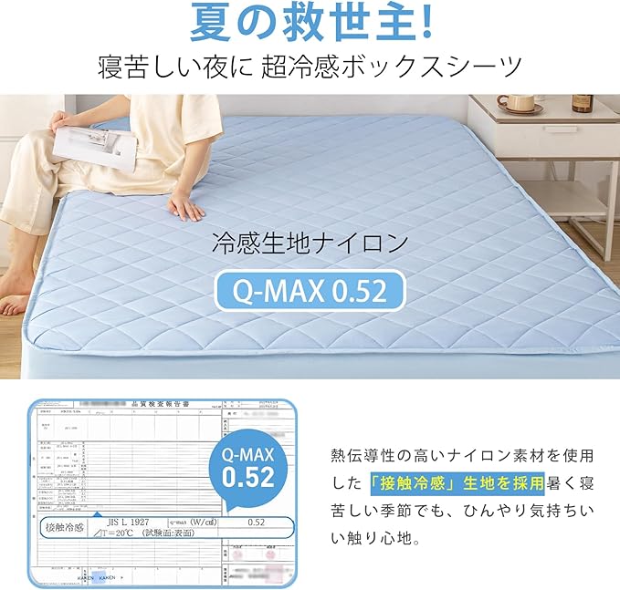 【パッド一体型設計!Q-MAX0.52冷感】敷きパッドとボックスシーツ両方の機能が揃えて、表面はナイロン100%を採用して、普通のボックスシーツよりも柔らかく快適な寝心地を提供してくれます。寝返りのたびに冷たさが持続。体が触れていない部分は温度が下がって冷感が戻るので寝返りのたびにひんやりして一晩中快適になります