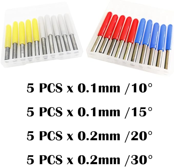 ➤パッケージ:20個の彫刻ビットCNCルーターツール-0.1mm(10 15 )0.2mm(20 30 )(角度ごとに5個)、および2個の保管ボックス。