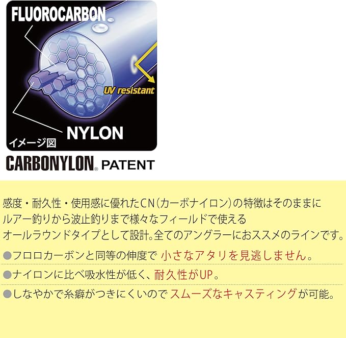 【CARBONYLON PATENT】:感度・耐久性・使用感に優れたCN(カーボナイロン)の特徴はそのままに、ルアー釣りから波止釣りまで様々なフィールドで使えるオールラウンドタイプとして設計。<br>全てのアングラーにおススメのラインです。