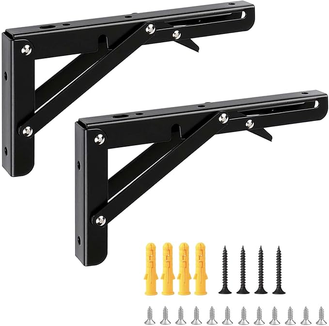 折りたたみL字型棚受けブラケット金具 x2、小ネジ x12、大ネジ x4、膨張チューブ x4です。注:棚板と装飾は含まれていません。 電動ドライバーがなければ、取り付けはしんどくなるかもしれません。 この製品は取付経験のない方に向いていません。 設置する前に、手袋などを着用して取り付けてください。