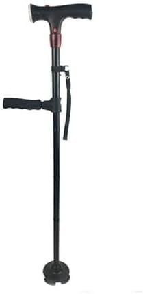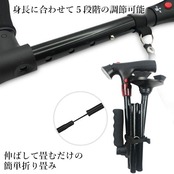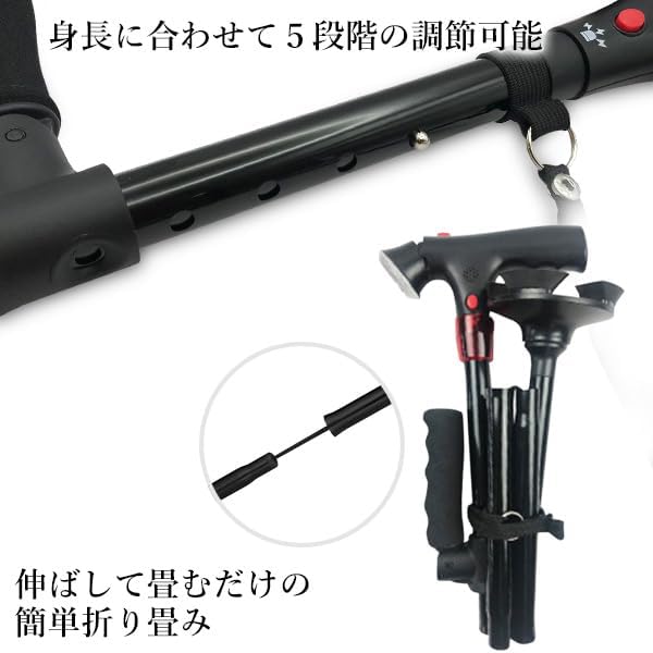 【商品説明】 ・自立式で折りたたむことができる杖です。 ・5段階の長さ調節付きで自分に合った長さに調節することができます。 ・4点で支える自立式なのでスマホを触るときなどに手を放しても倒れません。 ・立つときと座るときに使える補助ハンドル付きです。 ・LEDライト付きで足元を照らしたり、鍵穴を照らすのに役立ちます。 【商品仕様】 カラー ブラック 素材 アルミニウム合金