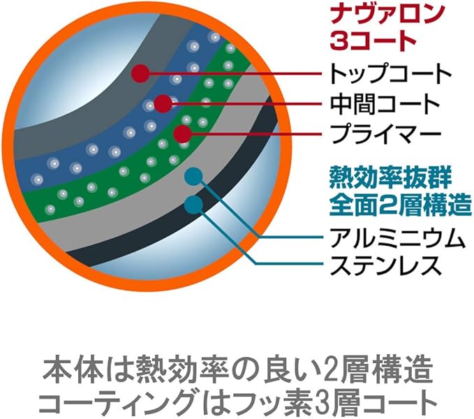 抜群の耐摩擦製を持つナヴァロン3コート(高密度3層フッ素樹脂コーティング)で焦げ付きを防止