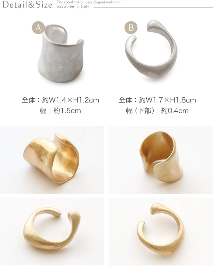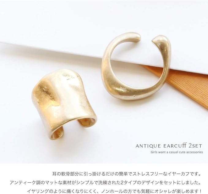 耳の軟骨部分に引っ掛けるだけの簡単でストレスフリーなイヤーカフです。 アンティーク調のマットな素材がシンプルで洗練された2タイプのデザインをセットにしました。 イヤリングのように痛くなりにくく、ノンホールの方でも気軽にオシャレが楽しめます!