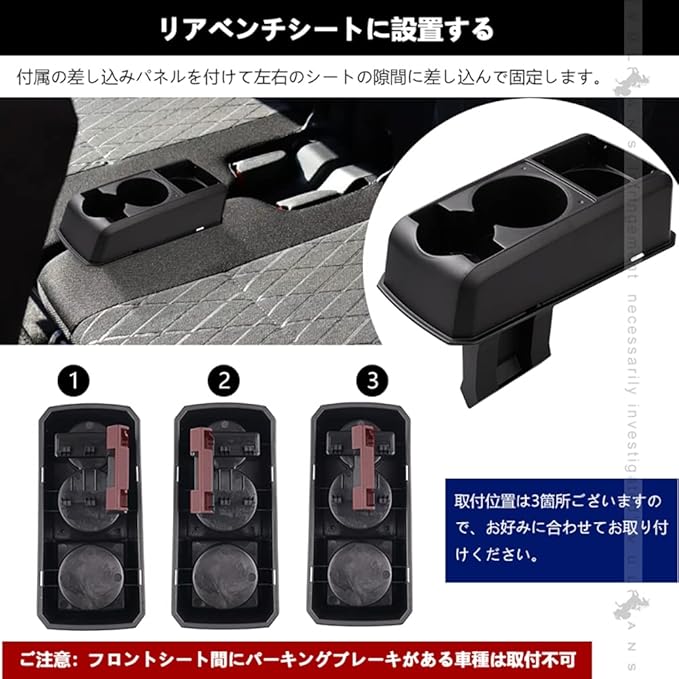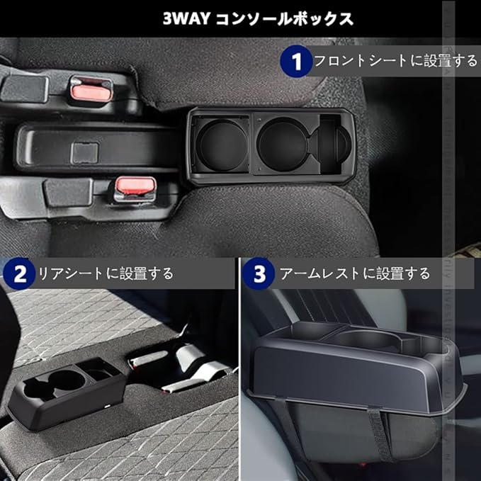 フロントシートに設置する場合<BR> 左右のシートに挟み込み、純正のセンターコンソールの上に載せます。シートを前後調整する場合はコンソールも同時に動きますので、本商品を外してから行ってください。<BR> リアベンチシートに設置する<BR> 付属の差し込みパネルを付けて左右のシートの隙間に差し込んで固定します。<BR> 取付位置は3箇所ございますので、お好みに合わせてお取り付けください。<BR>