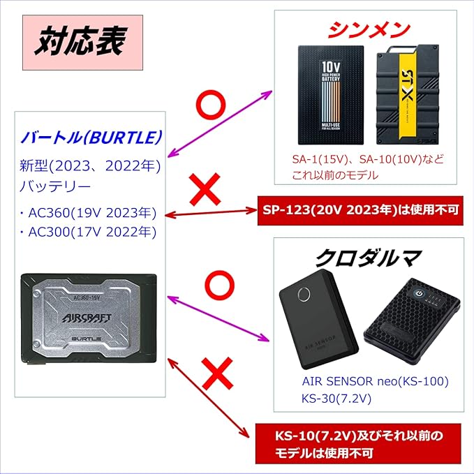 【対応機種】 □バッテリー:バートル AC08(22v 2024年)、AC360(19v 2023年)、AC300(17v 2022年) □ファン:シンメン S-AIR SA-1(15v)、SA-10(10v)など クロダルマ AIR SENSOR neo(KS-100)、KS-30(7.2v)