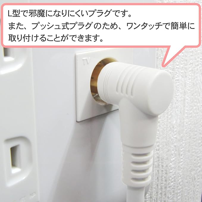 カラー:ホワイト、プラグ形状:片側:L型/片側:ストレート、ケーブル規格:S-4C-FB-AL、インピーダンス:75Ω、ケーブル長 : 1.5m、包装:簡易パッケージ
