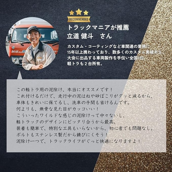 ✅素材はゴムではなく硬い丈夫な素材を使用しておりますので、柔軟性はありません。 【耐久性】高品質な素材を使用し、長期間の使用に耐える耐久性を備えているマッドガードです。 【保護機能】車輪から飛び散る泥や砂、小石などを効果的に防ぎ、車体や周囲の車両・人に汚れやダメージを与えません。泥除けとしての機能を果たします。 【設置簡単】付属のボルトで軽トラックの車体に簡単に取り付けられ、取り外しも容易です。軽トラックの多くのモデルに対応しています。 【スタイリッシュデザイン】車体と調和するデザインで、軽トラの外観を美しく保ちます。軽トラのカスタムパーツとしてご利用頂けます。 【注意事項】取り付け前に、車両の取扱説明書を必ず確認し、適切に取り付けてください。製品は泥や砂などの飛び散る物質を防ぐ目的で設計されていますが、完全な保護を提供するものではありません。運転時には安全を確保するために適切な注意を払ってください。