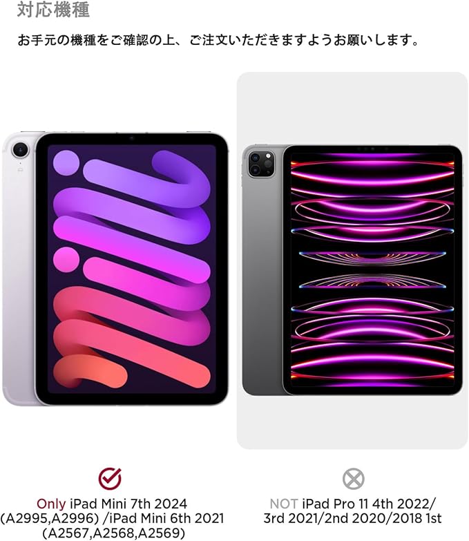 【対応機種】2024年発売のiPad Mini 第7世代 8.3インチ(モデル番号:A2995)及び2021年発売のiPad Mini 第6世代 8.3インチ(モデル番号:A2567 / A2568 / A2569)を向けに設計した専用背面カバーです。ご注意:お手元の機種をご確認の上、ご注文いただきますようお願いします。取り扱いやすくiPad Mini 7及びiPad Mini 6にピッタリフィットできる見栄えも保護力も両立させたアイパッド ミニ 7 / 6 ケースです。