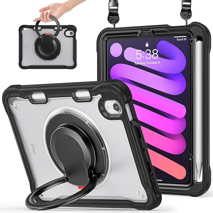Miimall 対応 iPad Mini7 ケース A17 Pro 2024 軽量 ペン収納 ショルダーストラップ付き 360度回転リング iPad Mini6 ケース 調整可能スタンド 耐衝撃 落下防止 半透明 肩掛け アイパッド ミニ 第7 6世代 用カバー 現場 子ども ブラック