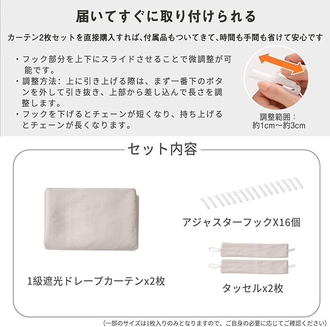 ご注意事項:既製カーテンは手作業で製作されているため、2cm程度の誤差が生じる場合がございます。あらかじめご了承ください。カーテンは輸送時に折りたたまれているため、しわが生じることがありますが、アイロンで簡単に解消できます。製造過程で生地にシミがつくことがありますが、手洗いや洗濯機で洗濯可能です。また、モニターや部屋の照明環境により、実物と色味や明るさが異なる場合がございます。ご不明な点がございましたら、お気軽にお問い合わせください