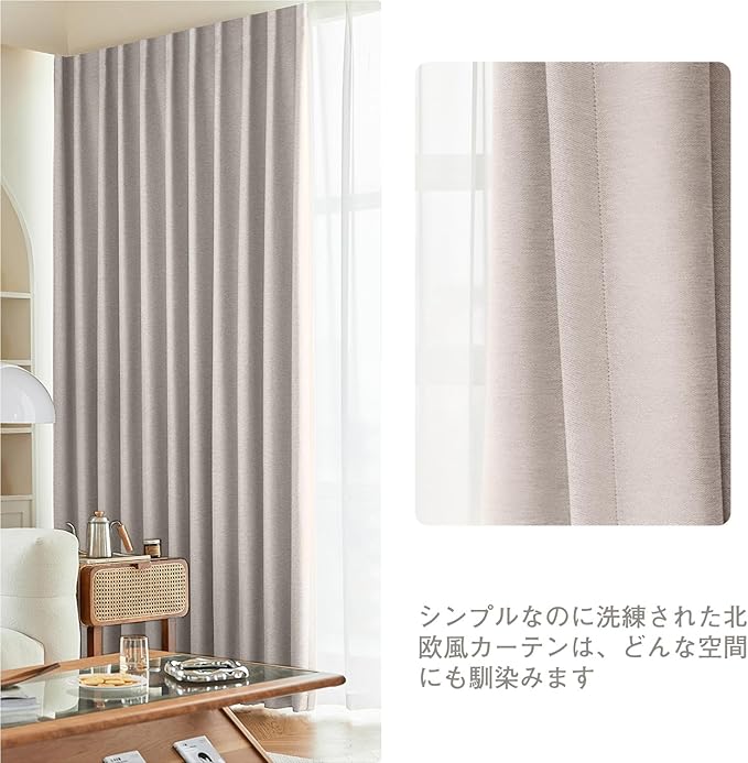 UVカット機能:リネン風生地のカーテンは、紫外線遮蔽率99%以上という高いUVカット性能を備えています。紫外線による家具・床・壁の色あせや劣化を防ぎ、お部屋を長く美しく保ちます。さらに、紫外線が直接室内に入るのを防ぎ、お肌へのダメージも軽減。特に日差しに敏感なご家庭や小さなお子様がいる家庭におすすめです