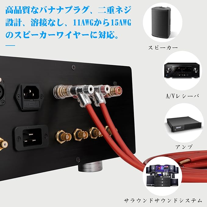 【適用ワイヤ】バナナプラグフラグサイズは最大6 mmです。 8AWGから14AWGまでのスピーカーワイヤーに対応します。