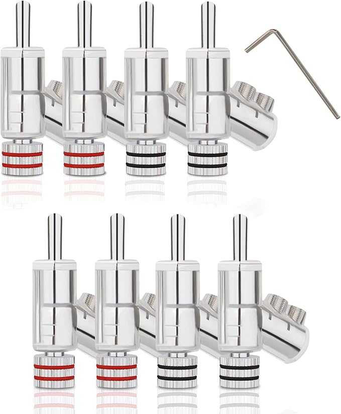Monosaudio 8本 バナナプラグ ロジウムメッキ オーディオ ピンデザイン取り外し可能 ダブルスクリュー高速ロック用 ハイエンドグレード バナナプラグ ケーブル 8AWGから14AWGまでスピーカーワイヤー対応 強耐腐食 導電性 耐酸化性 レッド&ブラック バナナ端子 L型六角レンチ付き(真鍮)