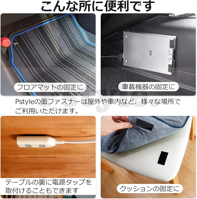 【使い方は無限大】 フロアマット、車載機器、テーブルの裏、クッションの固定など、Pstyle.の結束バンドは耐熱性にも優れておりますので、温度が上がりやすい屋外や車内でもお使いいただけます。