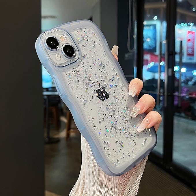 ZTOFERA iPhone 14用波状のケース 透明 クリア ケース かわいい カーリー ウェーブ シェイプ デザイン おしゃれ キラキラ 星 スマホケース ソフトTPU バンパーケース スターパターン 軽量 耐衝撃 人気 韓国 アイフォン14 ケース 女子 女性 携帯電話カバー(ブルー)