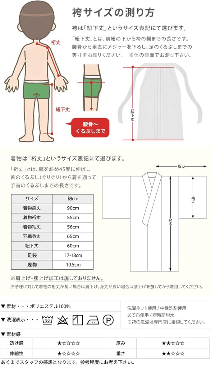 [サイズ]:着物:身丈90cm 裄丈55cm 袖丈:56cm、羽織:身丈65cm、袴:紐下60cm、履物:19.5cm、足袋:17-18cm
